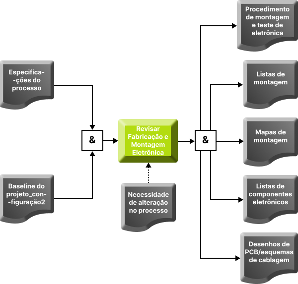 As entradas para essa atividade são a baseline2 do projeto e as especificações de processo desenvolvidas na fase 6 e atualizadas na fase anterior. As saídas são: um procedimento detalhado de montagem eletrônica no qual constem os testes a serem realizados com as partes recebidas para a montagem e os testes finais relacionados à funcionalidade da mesma, listas e mapas de montagem eletrônica e listas de componentes eletrônicos para aquisição.